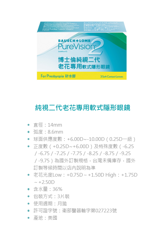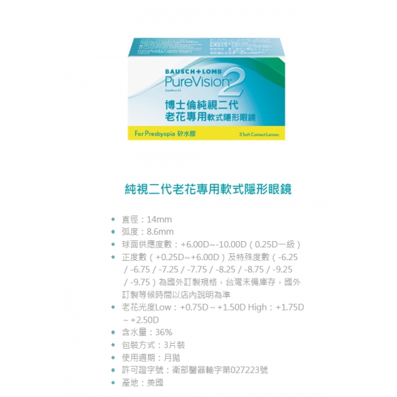 博士倫純視二代老花專用軟式透明月拋3片裝